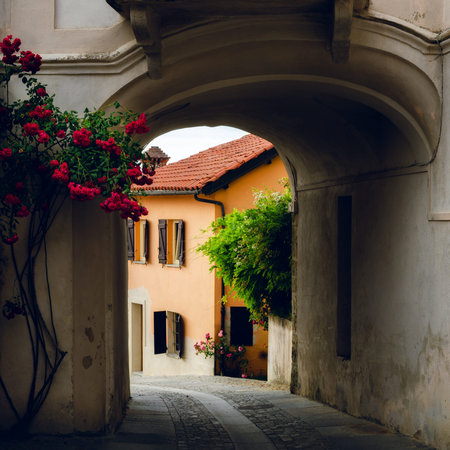 Narrow alley in the beautiful village of Bossolasco, one of the most visited places in Langhe hills (Piedmont, Italy). The town is famous for its roses, growing over houses and balconies