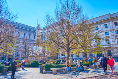 MILAN, ITALY - APRIL 5, 2022: Relax in the center of Milan oon the bench in Piazza della Scala, on April 5 in Milan, Italy