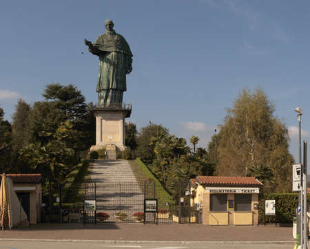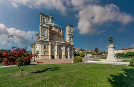 Vicoforte, Cuneo, Piedmont, Italy - October 13, 2021: Sanctuary of the Nativity of Mary with largest elliptical dome in the world in front of the statue of Carlo Emanuele I of Savoy