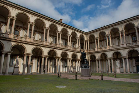 Milan Italy May 3 2021: interior of the Brera Fine Arts Academy in Milan with garden portico and statues
