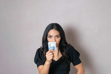 Successful SMM woman. Money making business. Female at workplace with dollar bills in hands. Great work, good profit.