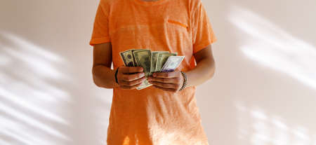 satisfied smiling young man with afro hair wearing white casual style t-shirt, holding dollar bills at camera.