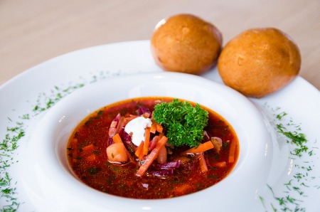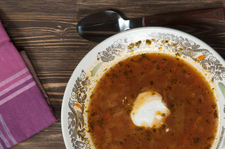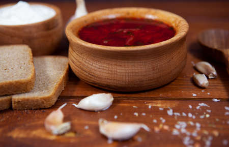 Traditional ukrainian soup - borsch, on the woodenn table