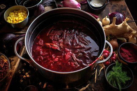 overhead view of beetroot soup preparation, created with generative ai