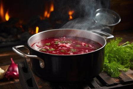 freshly cooked borscht with steam rising from pot, created with generative ai