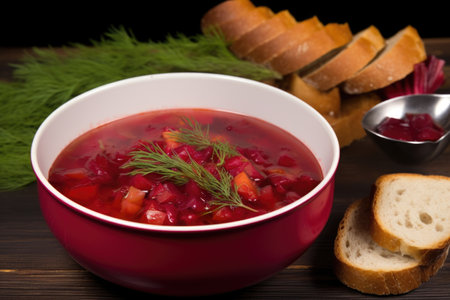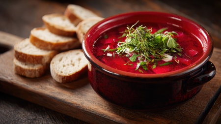 Traditional red borscht soup served with fresh herbs and bread.