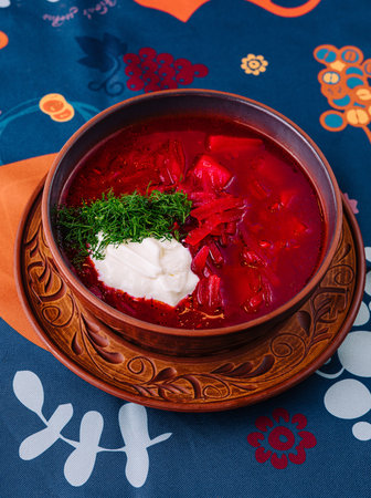 Vibrant bowl of traditional borscht garnished with sour cream and dill on a patterned tablecloth