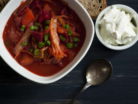 Traditional ukrainian borscht with green onion and sour cream. Delicious beet soup in bowl with rye bread