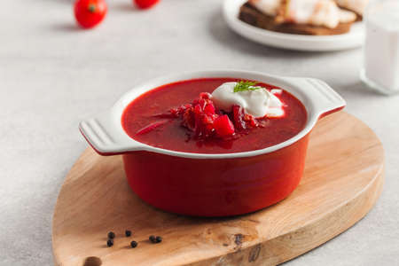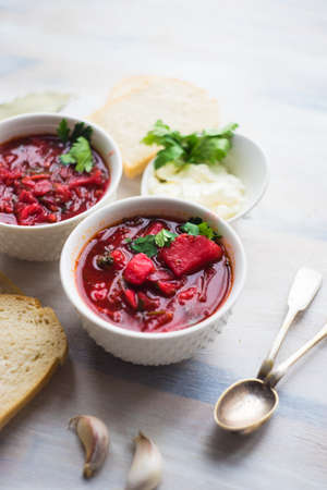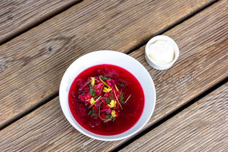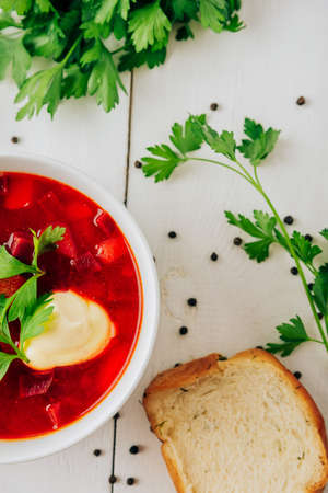 Traditional ukrainian beet soup - red borscht with sour cream and parsley on white wooden table