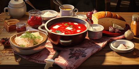 Delicious fresh red borscht, dark bread with lard and salt n kitchen table.
