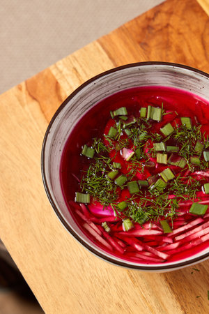 Vegetable cold soup with beet, cucumber, radsih and egg on wooden table.