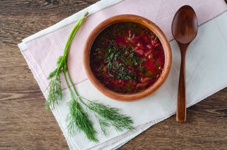 Borsch. Beet soup. Ukrainian cuisine. On a wooden background. Top view. Free space for your text.
