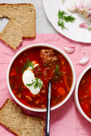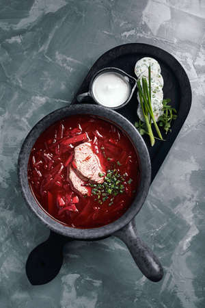 Traditional Russian and Ukrainian borsch, red soup with bread on a dark background. Borsch with meat, sour cream and dill. Overhead Copy Space