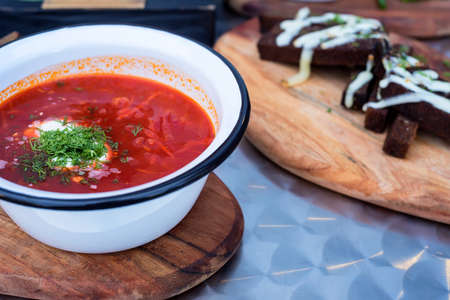 Traditional Ukrainian Russian vegetable soup, borsch with garlic donuts and bread
