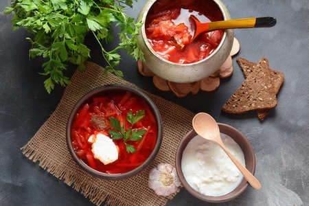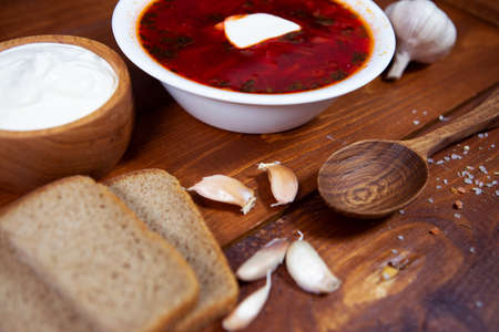 Borscht is a traditional Ukrainian and Russian beetroot Soup on a dark wooden background next to garlic, bread and sour cream. Close-up photo