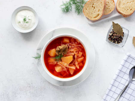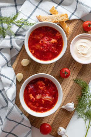 Ukrainian traditional borsch. Russian vegetarian red soup in white bowl on red wooden background. Top view.