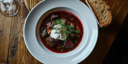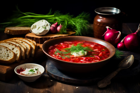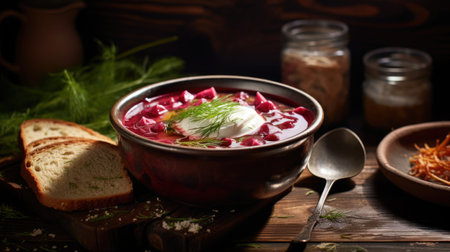 Close-up of red beetroot borscht soup in a bowl with a dollop of sour cream, accompanied by bread on a wooden table, classic Eastern European comfort food, warm and delicious