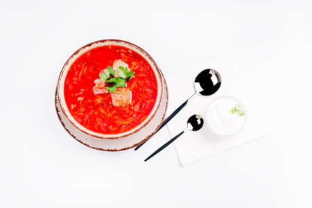Ukrainian borsch on a white plate with spoons and a plate of sour cream. Delicious food, soups.Traditional Ukrainian Russian vegetable soup.