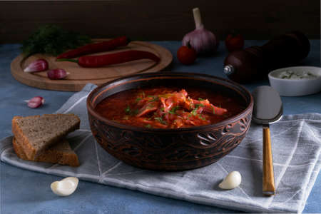 Ukrainian national cuisine, red borsch with meat and sour cream in a brown clay bowl