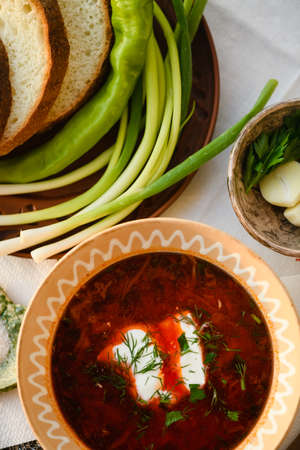 Traditional Ukrainian borscht. Clay Bowl of red beet root soup borsch with white cream.