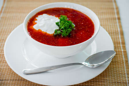 Traditional Ukrainian borscht, bowl of red beet root soup borsch