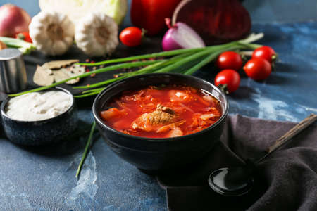Bowl of traditional soup Borscht on table