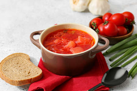 Pot of tasty borscht and ingredients on light background