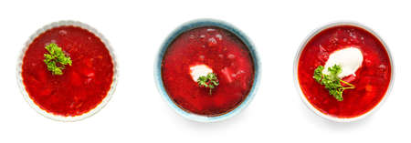 Bowls of tasty Ukrainian borscht with sour cream on white background