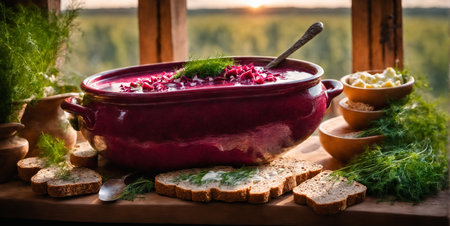 A vibrant bowl of borscht sits on a rustic wooden table, surrounded by slices of fresh bread. The warm glow of sunset spills through the window, adding charm to the cozy setting.