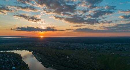 Panoramic aerial view of the nature landscape with green meadows and a river at sunset.