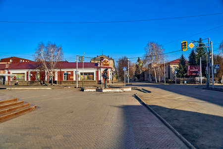 UST-KAMENOGORSK, KAZAKHSTAN - APRIL 04, 2020: Strange, amazing, unusual view of the empty streets of spring Ust-Kamenogorsk due to the first day of offitial COVID-19 pandemic - no people on the street