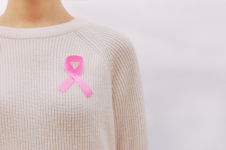 Stock photo of a woman with a pink ribbon on a white sweater to support the fight against cancer