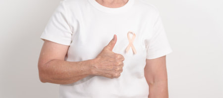 Elderly woman with Peach Ribbon for September Uterine Cancer Awareness month, Endometrial Cancer, Gynecologic, Uterus and Ovaries, Endometriosis, Vaginal cancer and World cancer day concept