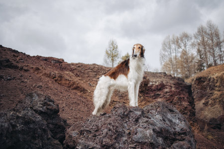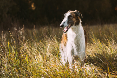 Russian greyhounds in nature. Russian borzoi dog stands against the background of autumn nature. Animal concept.