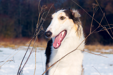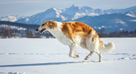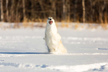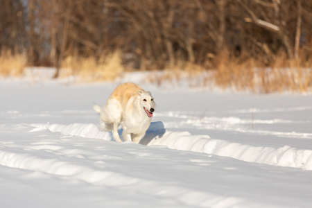 Portrait of happy and cute beige and white Russian borzoi dog or wolfhound running fast on the snow in the winter field