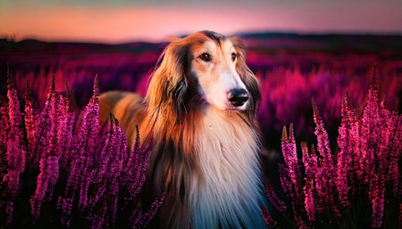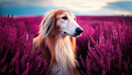 Beautiful portrait of a dog breed Afghan hound in the lavender field