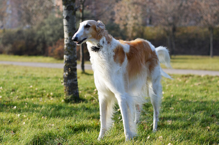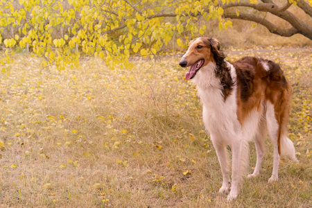 borzoi dog breed Russian greyhound on the background of an autumn park. Place for text.