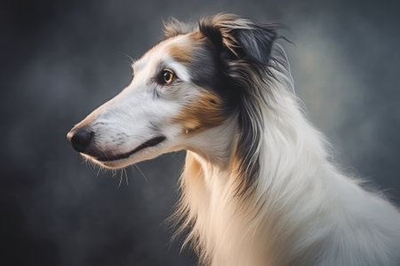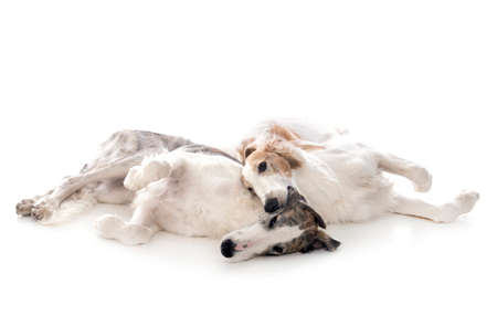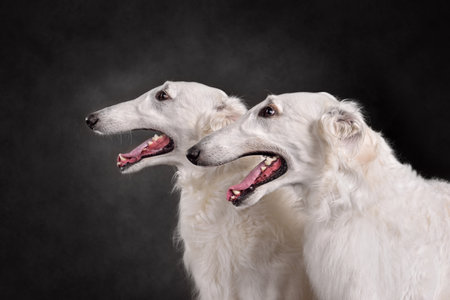 Portrait of beautiful white Russian wolfhound dogs on a gray background