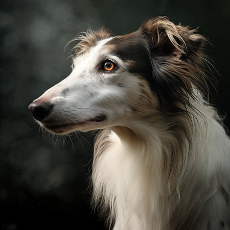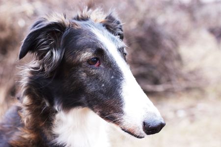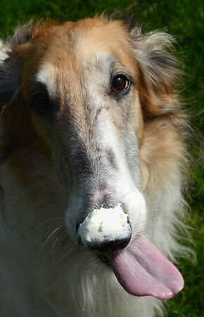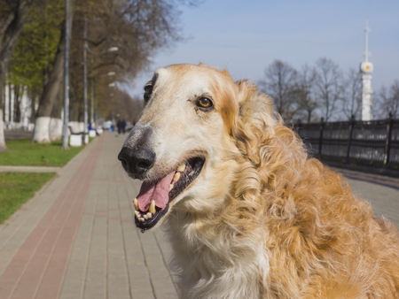 Russian Wolfhound Dog, Borzoi, Sighthound, Russkaya Psovaya Borzaya, Psovi. Killer of wolves. One of the fastest hunting dogs in the world. Springtime, Outdoors. Close-up Portrait