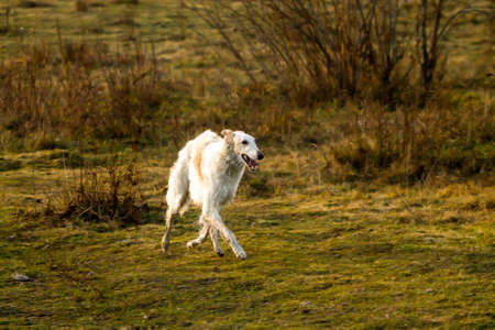 Dog breed Russian canine greyhound runs across the field in early spring. Sunset.