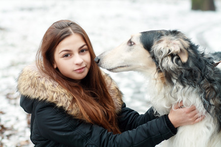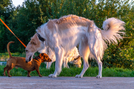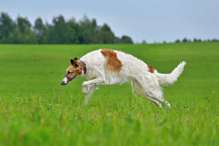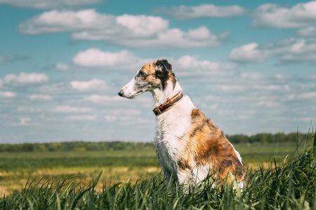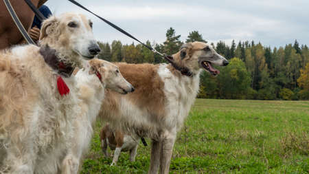 Russian Wolfhound Dog, Borzoi walk, Sighthound, Russkaya Psovaya Borzaya, Psovi. Killer of wolves. One of the fastest hunting dogs in the world. Springtime, Outdoors