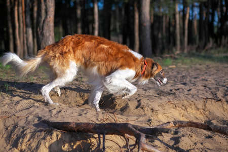 Red and white puppy of borzoi walks outdoor at autumn day, russian sighthound, eight months