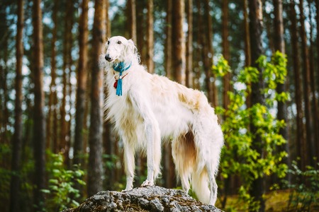 White Russian Borzoi, Hunting Dog standing on a rock in summer forest.