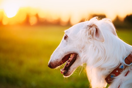 Close up White Russian Dog, Borzoi in Summer Evening, Sunset Sunrise