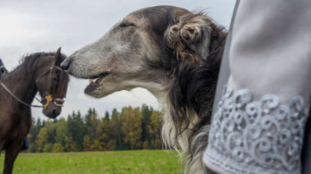 Beautiful russian borzoi or greyhound dogs with horse. Close-up view of dogs and hotse heads. Animal concept. Historical reconstruction of the traditional hunting with russian borzoi dogs.