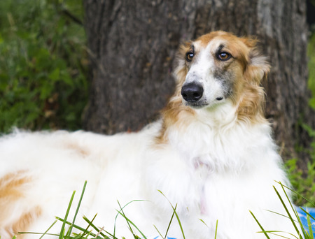 White Russian Wolfhound Dog, Borzoi, Hunting dog, Sighthound in Spring Summer Forest. These dogs specialize in pursuing prey, keeping it in sight, and overpowering it by their great speed and agility