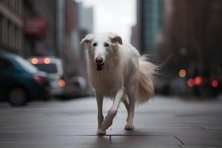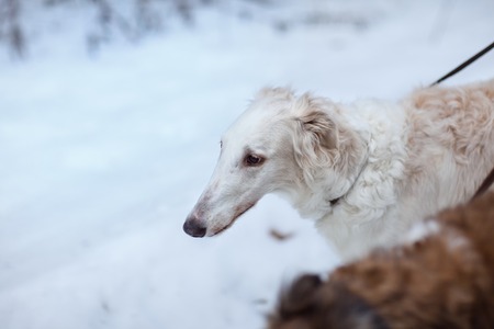 White puppy of borzoi walks outdoor at winter day, russian sighthound, nine months old