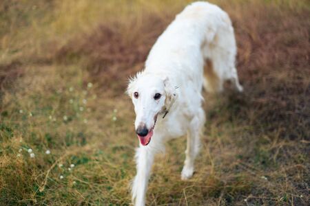 White Russian Borzoi, Russian Hunting dog sit in autumn grass. Russkaya Psovaya Borzaya, Psovoi.