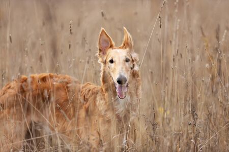 Hunting dog Russian borzoy breed runs forward on autumn background