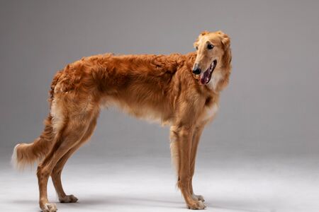 Red puppy of borzoi stand indoor at photostudio, russian sighthound, seven months